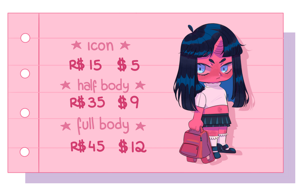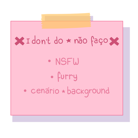 atualizações para aprovação em cada etapa até a finalização.Horário de atendimento: de segunda a sexta-feira, das 10h às 19h (horário de Brasília). Mensagens enviadas fora deste período serão respondidas no próximo horário útil.⭑ ComissãoPara iniciar o serviço, o cliente precisa enviar todos os detalhes do pedido (exemplo: quantos personagens, plano de fundo, paleta de cores, imagens de referência ou qualquer outra coisa disponível).O prazo de entrega será combinado dependendo da complexidade do serviço. Em caso de prorrogação, o cliente será informado com antecedência.A arte finalizada poderá ser publicada em minhas redes sociais, exceto quando o cliente,solicitar explicitamente que o pedido seja mantido privado.Após a aprovação do orçamento e detalhes, o trabalho será iniciado em até 5 dias úteis.Todas as artes incluem minha assinatura. Caso solicitado, ela poderá ser posicionada de forma discreta.⭑ Uso da ImagemO pagamento garante ao cliente apenas o uso pessoal da arte. Se publicada em redes sociais, é obrigatório me dar os créditos.É estritamente proibido utilizar a arte em geradores de imagens por inteligência artificial ou revendê-la sob qualquer forma.