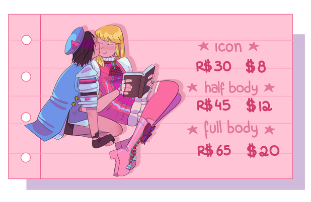 atualizações para aprovação em cada etapa até a finalização.Horário de atendimento: de segunda a sexta-feira, das 10h às 19h (horário de Brasília). Mensagens enviadas fora deste período serão respondidas no próximo horário útil.⭑ ComissãoPara iniciar o serviço, o cliente precisa enviar todos os detalhes do pedido (exemplo: quantos personagens, plano de fundo, paleta de cores, imagens de referência ou qualquer outra coisa disponível).O prazo de entrega será combinado dependendo da complexidade do serviço. Em caso de prorrogação, o cliente será informado com antecedência.A arte finalizada poderá ser publicada em minhas redes sociais, exceto quando o cliente,solicitar explicitamente que o pedido seja mantido privado.Após a aprovação do orçamento e detalhes, o trabalho será iniciado em até 5 dias úteis.Todas as artes incluem minha assinatura. Caso solicitado, ela poderá ser posicionada de forma discreta.⭑ Uso da ImagemO pagamento garante ao cliente apenas o uso pessoal da arte. Se publicada em redes sociais, é obrigatório me dar os créditos.É estritamente proibido utilizar a arte em geradores de imagens por inteligência artificial ou revendê-la sob qualquer forma.